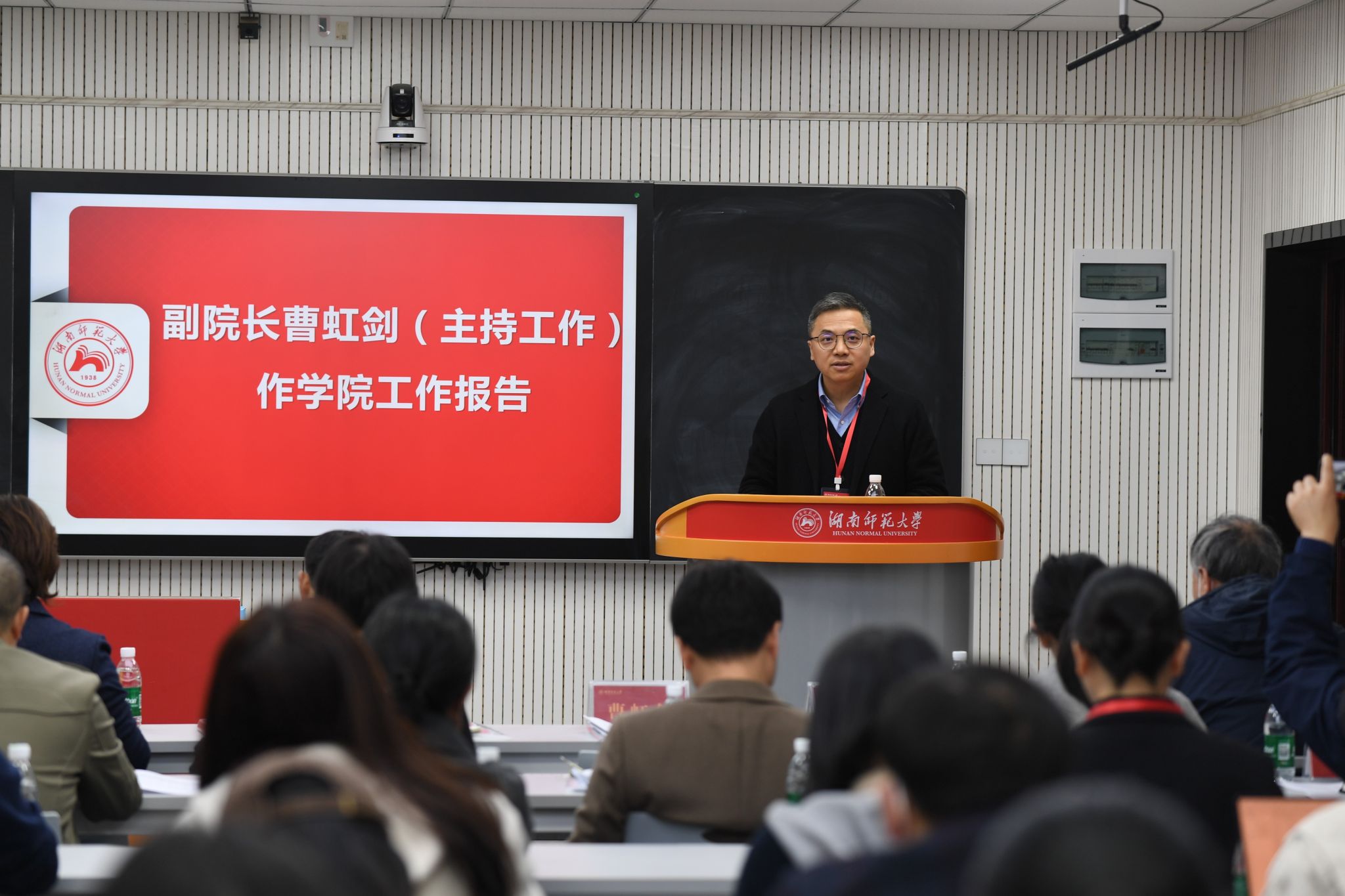 副院长曹虹剑(主持日常行政工作)向大会作了题为《团结创新 砥砺前行 奋力开创学院事业高质量发展新局面》的工作报告,全面回顾“十四五”期间学院在党建引领、学科建设、育人改革、师资队伍、条件保障等方面的丰硕成果,明确了未来以高质量学科建设为引领、构建一流人才培养体系、强化科研创新与社会服务、建强师资队伍、增进教职工福祉的发展方向。