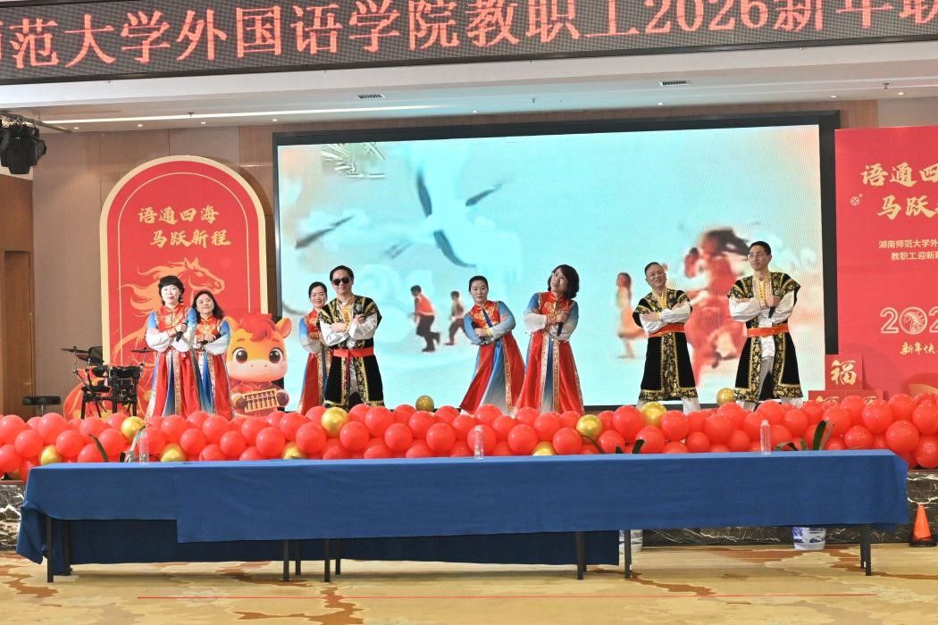 联欢会节目精彩纷呈,形式多样。学院工会干部们以一段活力四射的开场舞《新年大吉》为大家开启一整年的祝福;贾艳芳、任海燕等老师与一颗苹果乐队联袂献上小合唱与乐队表演《2026创造至上 见刊快乐》,展现了激情与创造力;学院领导班子成员则一改平日严肃,带来欢乐歌舞《最炫民族风》,引来阵阵掌声与欢笑。卢锦淑、王佳丽等十四位老师表演的《八段锦》刚柔并济,韵味十足;戴霁斌、胡云天、杨欣雨、李沁四位老师的小合唱《故湘风》深情款款,寄托乡愁;梁斌、侯奇焜、段农乾老师携手体育学院博士生带来的《沧海一声笑》小合唱与武术表演则飘逸恢宏,尽显豪情。杨雨箫、阳凌艺等五位老师带来的流行歌舞《蛋饺肉丝Danger Rose》活力四射,点燃青春激情。压轴登场的是由曾艳钰、陈敏哲等十五位教授组成的豪华阵容,他们的小合唱《如愿》深情而磅礴,唱出了对教育事业、美好生活与家国情怀的深切期盼,感人至深。