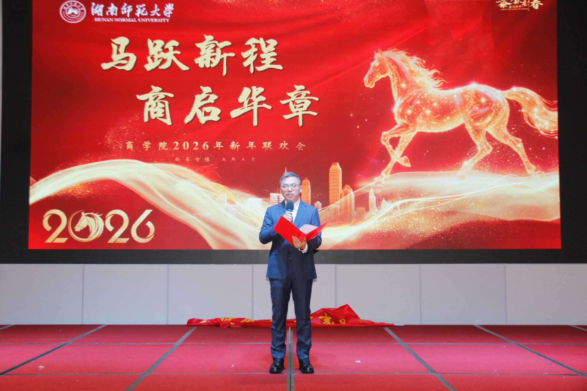 学院副院长(主持工作)曹虹剑发表新年贺词,他代表学院向全体师生员工、离退休老同志、各级领导、各界朋友及广大校友致以诚挚感谢和祝福,对 2025 年学院在党建引领、学科建设、人才培养、科研创新等方面取得的成绩进行了简要回顾。他指出,这些成绩的取得离不开每一位商院人的智慧与汗水,2026 年作为 “十五五” 开局之年,学院将锚定目标、乘势而上,为学校 “双一流” 建设贡献商院力量。
