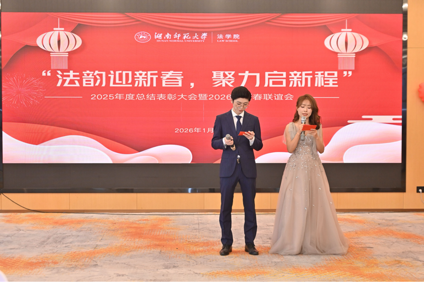 (通讯员 周莹)1月16日下午,法学院举行“法韵迎新春,聚力启新程”2025年度总结表彰大会暨2026年新春联谊会。学院各地校友会代表、党政工领导班子成员、全体在校专任教师、行政管理老师、司法鉴定中心和法律援助中心成员齐聚一堂,共同回顾过去一年的奋斗历程,展望新的一年。会议由教师姚迪、刘阳担任主持。