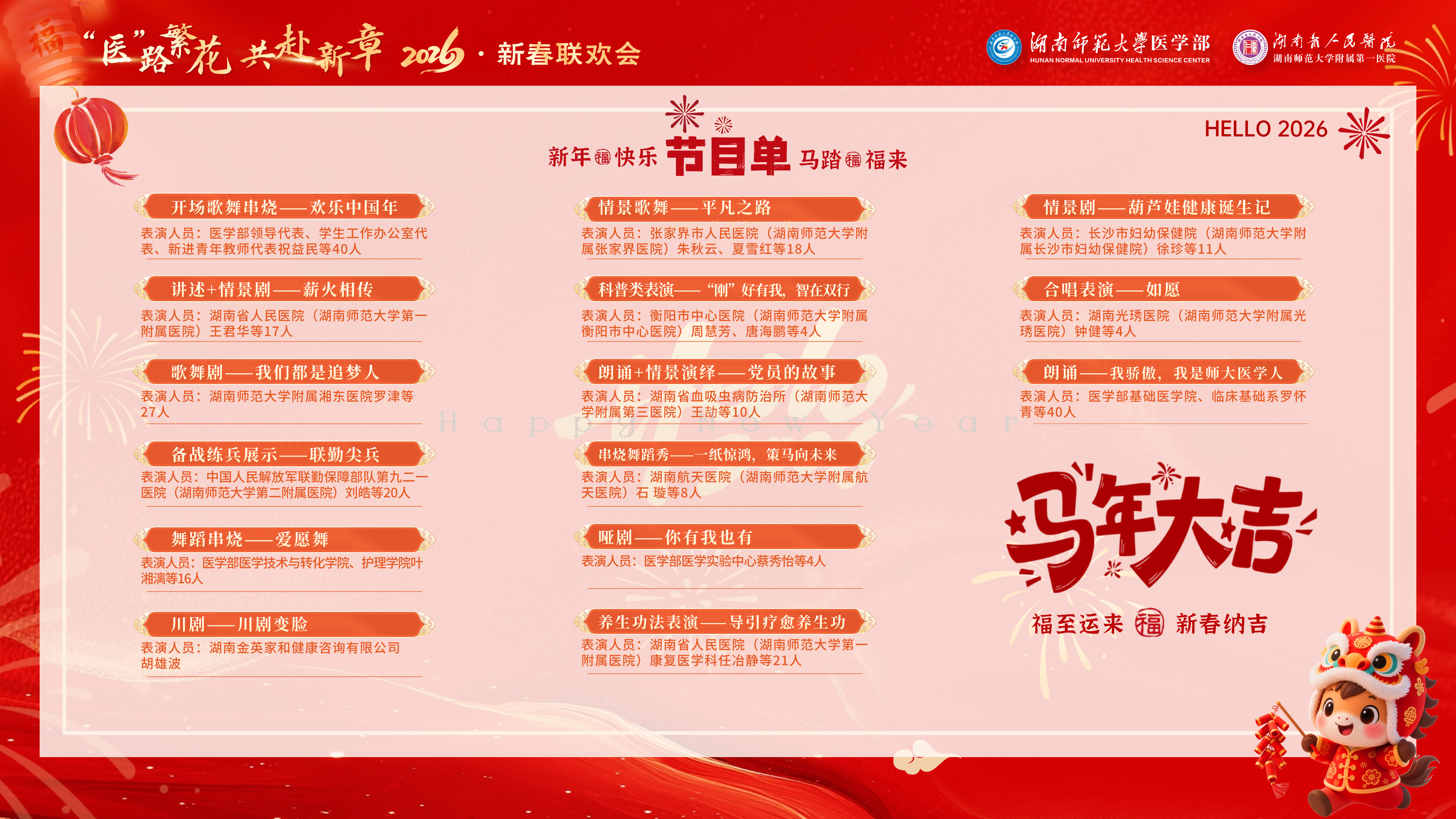 本次联欢会由医学部及各附属医院精心选送节目,形式多样、精彩纷呈。开场歌舞串烧《欢乐中国年》瞬间点燃现场喜庆氛围。湖南省人民医院的情景剧《薪火相传》生动演绎了三代肝胆人跨越数十年的医者传承;附属湘东医院的歌舞剧《我们都是追梦人》展现了服务老区、守护初心的执着坚守;中国人民解放军联勤保障部队第九二一医院的血性舞蹈《联勤尖兵》以充满力量与速度的舞步震撼全场。此外,医学技术与转化学院、护理学院的舞蹈串烧《爱愿舞》,特邀嘉宾金英家和公司带来的《川剧变脸》,附属张家界医院的情景歌舞《平凡之路》,附属衡阳市中心医院的科普类表演《“刚”好有我,智在双行》,湖南省血吸虫病防治所的情景演绎《党员的故事》,附属航天医院的串烧舞蹈秀《一纸惊鸿,策马向未来》,医学部医学实验中心的哑剧《你有我也有》,湖南省人民医院的养生功法表演《导引疗愈养生功》,长沙市妇幼保健院的情景剧《葫芦娃健康诞生记》,以及附属光琇医院的合唱《如愿》等节目,巧妙融合专业特色、传统文化、健康科普与时代精神,兼具艺术美感与教育意义,赢得阵阵掌声。由基础医学院、临床基础系教师带来的朗诵《我骄傲,我是师大医学人》,将现场气氛推向高潮,深情抒发了师大医学人投身医学教育、科研与临床事业的豪情与自豪。