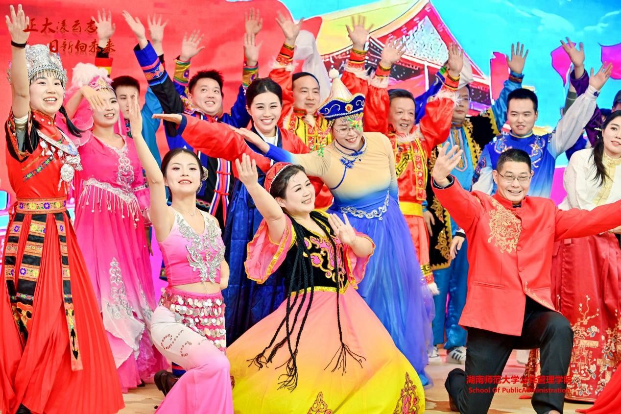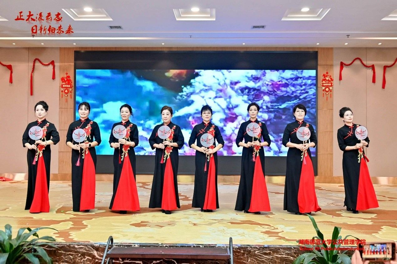 文艺展演环节精彩纷呈,各工会小组精心编排的节目轮番登场,为现场观众呈现了一场视听盛宴。其中,社会学系工会小组的开场舞《Zoo 狂欢派对》活力四射,瞬间点燃全场气氛;政行系工会小组的合唱《和你一样》温情脉脉,传递着同事间的真挚情谊;行政工会小组的舞蹈《新年快乐》喜庆祥和,洋溢着浓浓的年味儿。退休教职工带来的舞蹈《红梅赞》舞姿优雅、意蕴深远,彰显了夕阳正好的高洁怡然;老校长刘湘溶教授的独唱《天边》婉转悠扬,青年教师罗洋演绎的《八百里洞庭美如画》饱含地域风情,赢得阵阵掌声。最后,行政工会小组与院领导班子成员共同献上舞蹈《美丽中国》与合唱《相亲相爱》,将现场气氛推向高潮,唱出了公管院人同心同德、相亲相爱的深厚情谊。