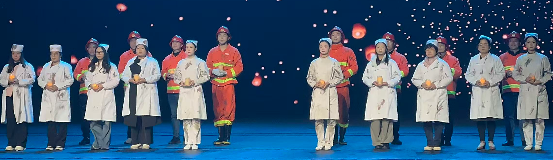 演出尾声,老师们积极参演汶川大地震救援情景剧。舞台上,每一次振臂高喊“中国加油”,每一次弯腰托起“伤者”,每一次“余震”中跌倒又爬起,都是对那段经历的深情致敬,也是一次深刻的精神洗礼。