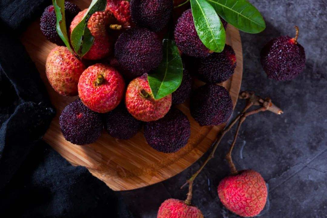 杨梅:杨梅盛产于我国南方,被称为“果中玛瑙”,素有“初疑一颗值千金”之美誉。杨梅果实色泽鲜艳,汁液多,酸甜可口,消食开胃。其含有的多种营养元素还能起到消炎抑菌、防癌抗癌、美容减肥等功效。