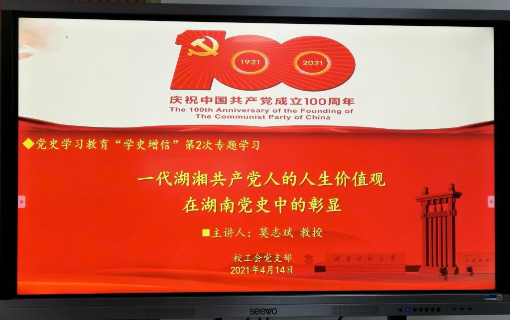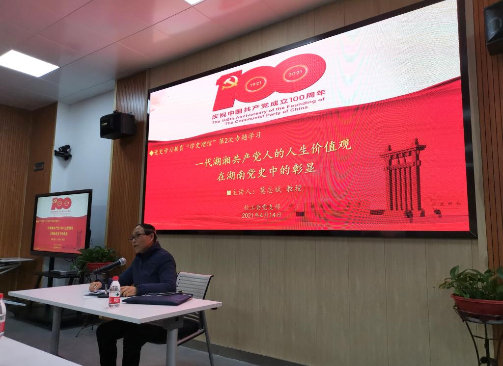 4月14日,WilliamHill体育党支部在信息化中心智慧教室开展党史学习教育“学史增信”第2次专题学习,历史文化学院博士生导师莫志斌教授以《一代湖湘共产党人的人生价值观在湖南党史中的彰显》为题,作了生动宣讲。